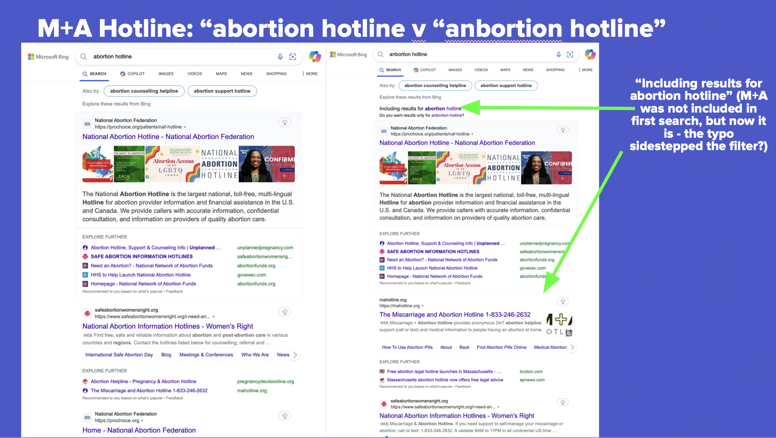 Descubrimos que las búsquedas de términos como "línea de apoyo para el aborto" o "guía de clínicas de aborto" ofrecen resultados muy diferentes dependiendo de la introducción de errores tipográficos en el término “aborto”. La falta de ortografía de la palabra “aborto” (piensa: "abbbortion" o "aNbortion") inesperadamente revela resultados diferentes y más precisos, incluidos recursos y servicios directos, mientras que en las búsquedas con sus contrapartes correctamente escritas (“aborto”) los servicios y organizaciones de aborto están misteriosamente ausentes de los resultados. Este fenómeno se extiende a varias organizaciones cruciales para la atención del aborto, incluido el Center for Reproductive Rights, la Línea de Apoyo M+A Hotline y servicios como Aid Access y Abuzz Health, y la National Network of Abortion Funds. Además, hubo varios casos de esto que ocurrieron en búsquedas en idiomas extranjeros, y fue notablemente evidente para las consultas de búsqueda en inglés relacionadas con países específicos, como “acceso al aborto en Alemania”.