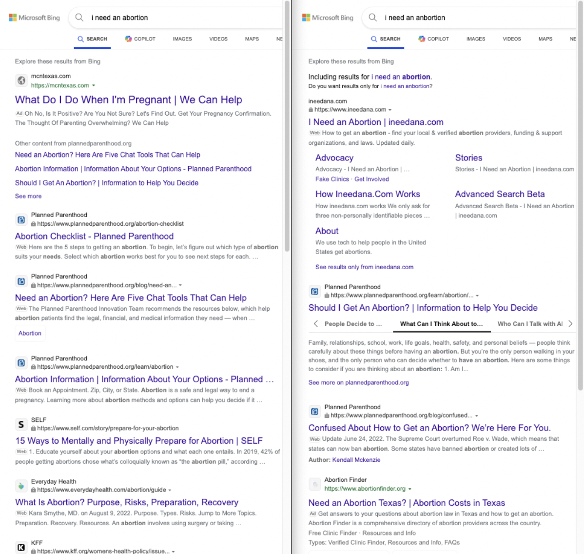 Nuestra conclusión es que esto no es un accidente o un fallo, este es un filtro que los miembros del equipo de Bing han creado para manipular los resultados de búsqueda, tal vez para evitar por completo la controversia sobre el aborto. No creemos que sea nefasto o antiacceso/antiaborto porque también parece filtrar los Centros de Crisis de Embarazo o las “clínicas falsas”.