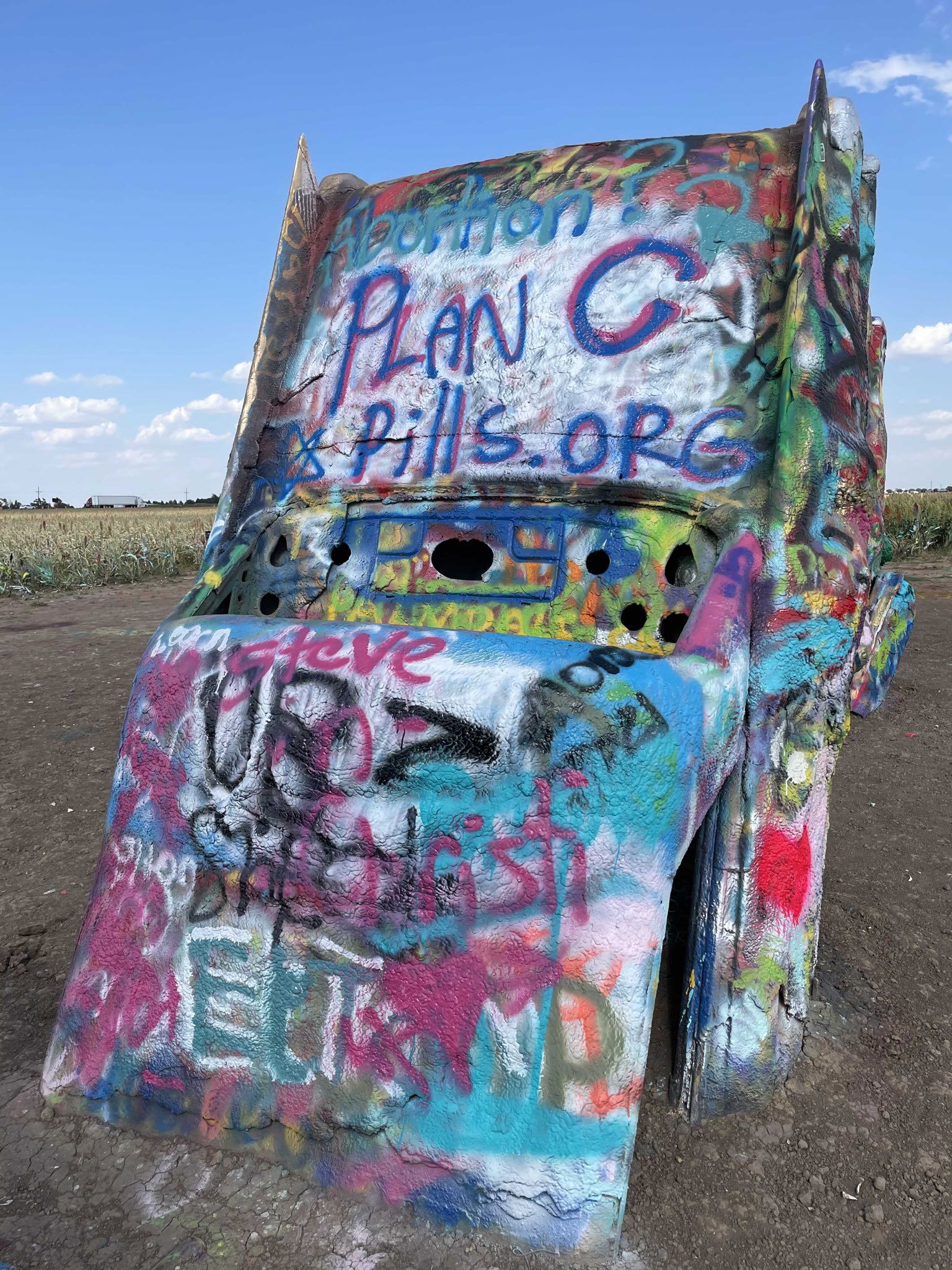 En Texas, continuamos nuestro viaje de arte y activismo en el histórico Cadillac Ranch: una instalación de arte "hágalo usted mismo" en Amarillo que presenta una fila de Cadillacs que sobresalen del suelo arenoso. Cada uno está decorado con décadas de grafitis de pintura en aerosol, marca sobre marca superpuestas para crear un collage colectivo caótico y hermoso.