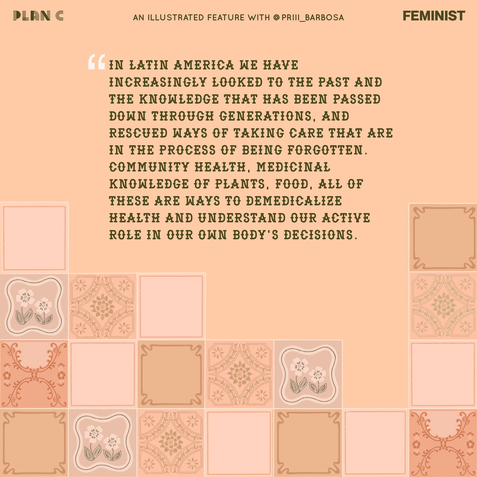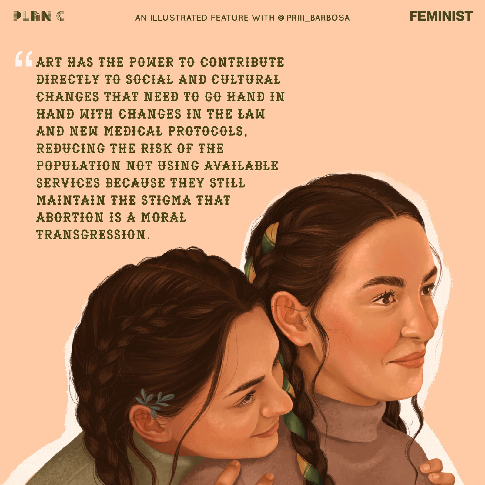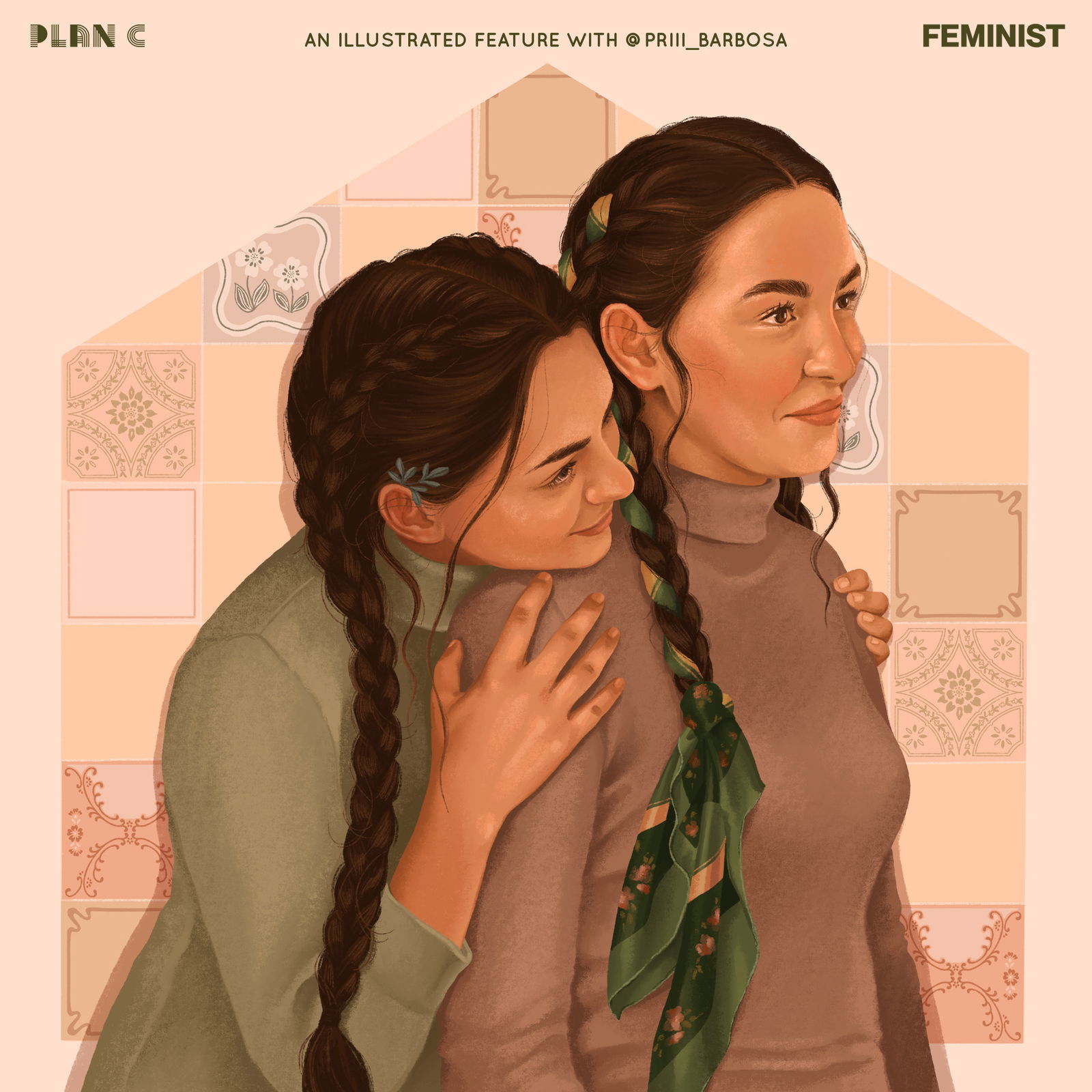 Para esta colaboración, realizada por invitación de Plan C, elegí ilustrar una escena que promueve el cuidado entre mujeres y fomenta la autovaloración y la autonomía. Las sitúo en un escenario que remite al hogar como ese lugar poderoso de transmisión de saberes y acogida, lleno de tradición. Una de las personajes lleva una ramita de ruda en la oreja, un símbolo muy potente en Brasil por su poder medicinal y espiritual, y que hoy es utilizado por el movimiento feminista brasileño con gran énfasis. La otra personaje tiene el cabello trenzado con un pañuelo que alude al pañuelo verde, símbolo de la despenalización y legalización del aborto en América Latina.
