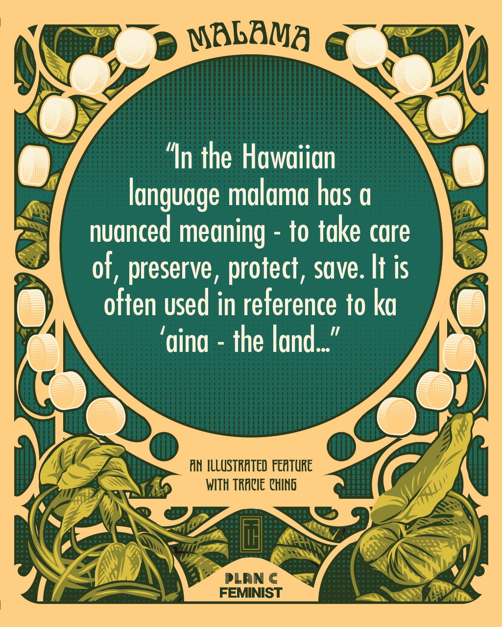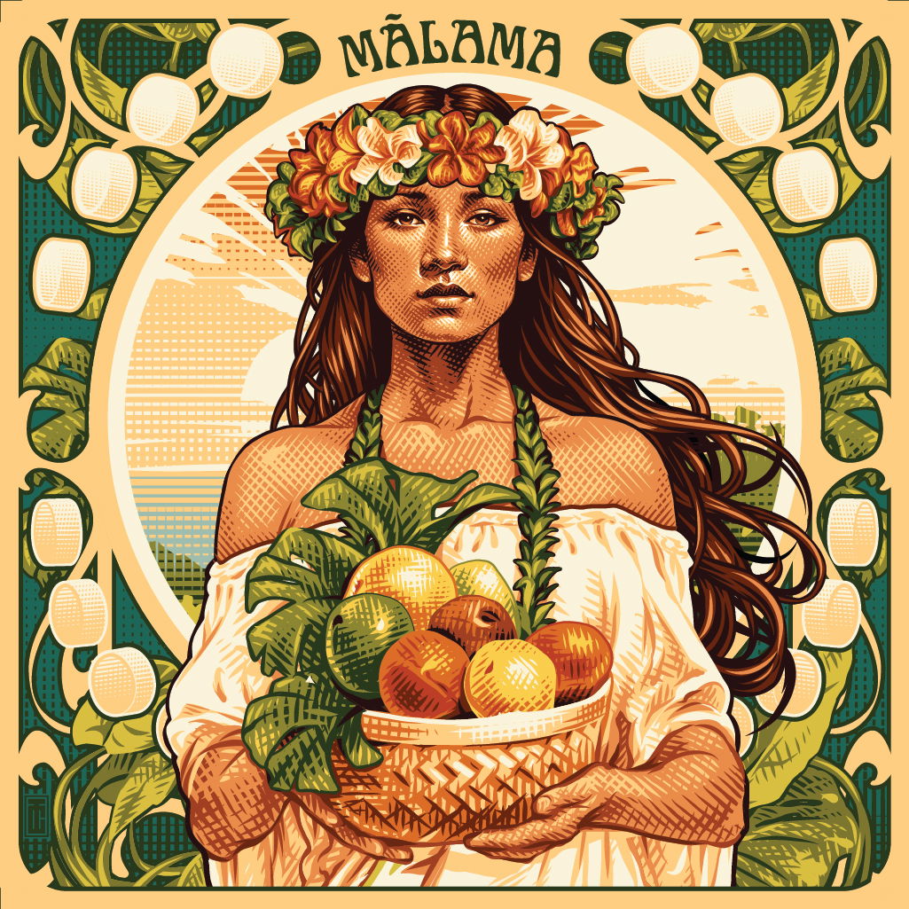 Nací en la isla de Oʻahu, pero me mudé cuando era joven. Para sanar algunas de mis heridas diaspóricas, obtuve un título en Estudios Hawaianos para comprender mejor a mi gente y mi cultura. Algo que quedó claro en mis estudios fue la importancia del mālama. En el idioma hawaiano, mālama tiene un significado matizado: cuidar, preservar, proteger, salvar. A menudo se utiliza en referencia a ka ʻāina, o la tierra. En la cultura hawaiana, todo y todos a lo largo del tiempo están conectados, unidos a la tierra. Nuestro deber para con todos los que nos precedieron y todos los que vendrán después es cuidar la tierra, cuidarnos mutuamente y cuidar nuestros cuerpos. Esta fue la inspiración para la ilustración de este artículo. Como artista, mi esperanza es perpetuar estos ideales sirviendo como conducto y representación.